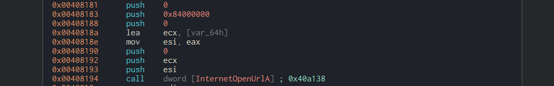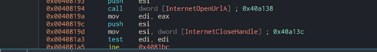 Before stepping over the code, we can see that the APIs below and the URL and see the parameters that were passed to the API functions. Also, in the InternetOpenUrlA, we can see the instruction esi was passed which refers to the URL as shown at the top of the code. We see that the esi=URL, and then the esi is passed to the API. We can also see the if else statements in the InternetCloseHandle function.
