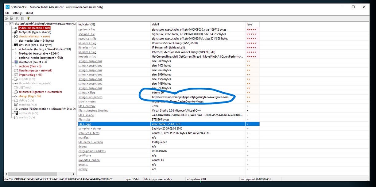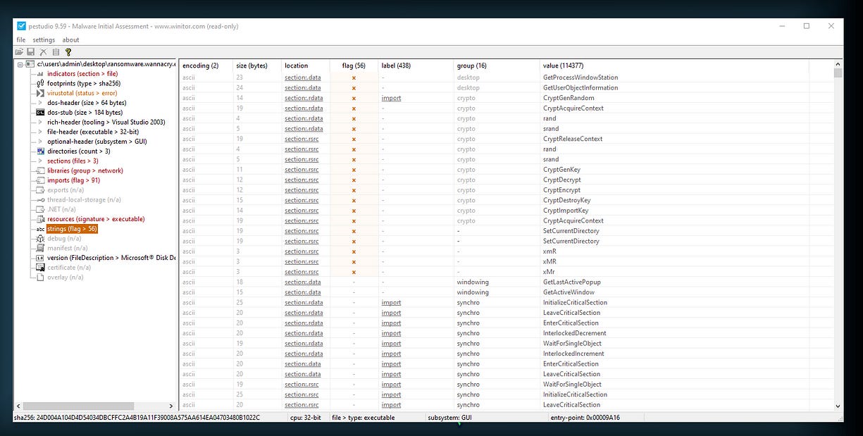I then decided to use PEStudio to further analyze the executable. This tool helped me discover additional suspicious API calls, strings, and other indicators that could reveal the malware’s behavior. PEStudio provided valuable insights into potential areas of concern within the binary.