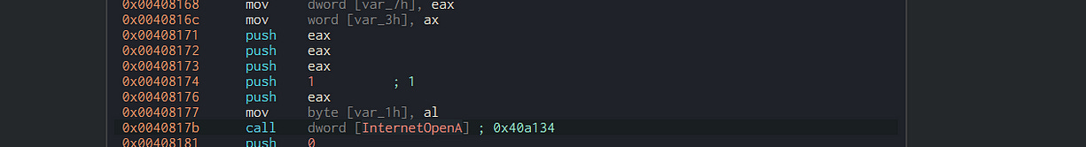 Below here, we can see the API calls used by the ransomware: InternetOpenA