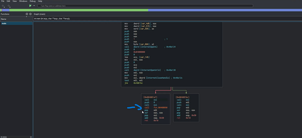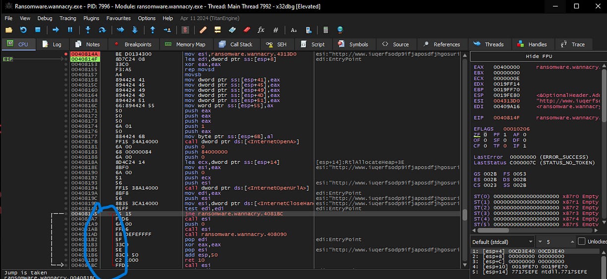 We can also notice that if the URL is reached, the zero flag will kill the program and use the return function to terminate it. If not, the zero flag will let the function go and start encrypting the data and doing other fun