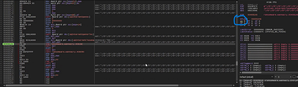 function. Here, I tested the conditions by modifying the Zero Flag (ZF), toggling it between 0 and 1, to observe how the malware responds. This approach helped me understand how the ransomware determines whether to activate the killswitch or proceed with its encryption functions, depending on the flag’s state.