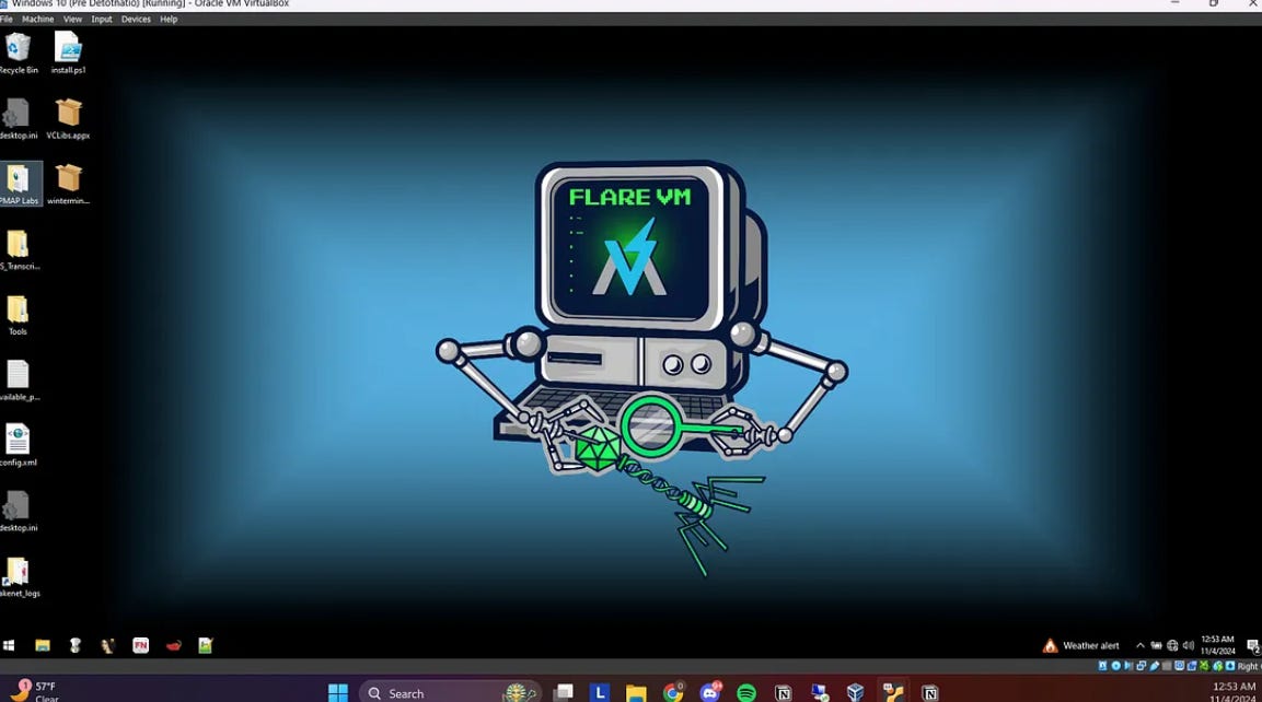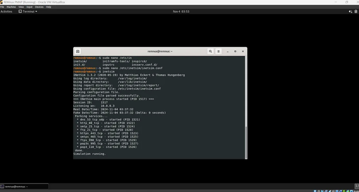 My environment setup includes the FLARE VM and REMnux VM for malware analysis. Additionally, I am using INetSim to create a fake web server; however, I will disable the web server to allow the malware to infect my system and observe its symptoms. I have also created adapters specifically for these two VMs to connect to each other and configured my DNS server to point to the REMnux IP address.