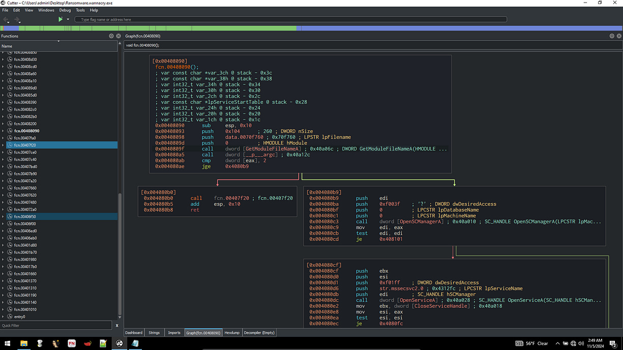 In this blog, I will analyze the WannaCry ransomware using static and dynamic analysis methods. I will begin by examining the executable’s properties without executing it, followed by observing its behavior during runtime. Finally, I will reverse engineer the WannaCry executable with debugging tools and Cutter, exploring the assembly code to uncover its operational mechanisms.