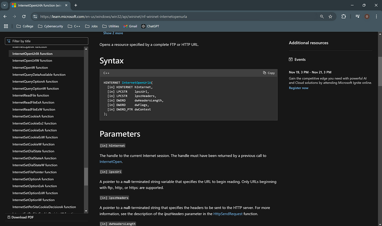 API function. If we're not familiar with what these API calls do, we can refer to the Microsoft documentation to learn about their functions and parameters. Additionally, by analyzing the push functions in the assembly code, we can gain further insights into how these API calls interact with the malware’s operations and how they contribute to the communication with external servers.