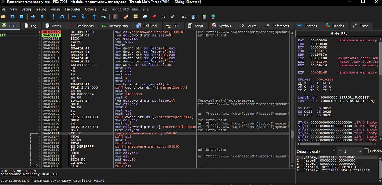 From that point, I will step over every instruction by pressing F8 in the Debugger x32 tool. This will allow me to execute the program line by line, providing a detailed view of each operation and helping me identify critical actions, such as file manipulation or network communication, to better understand the ransomware’s behavior.