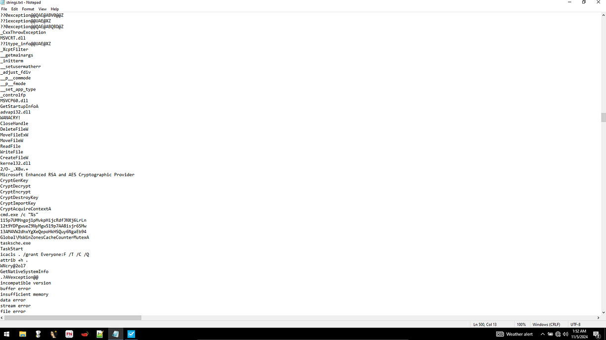 I started by using FLOSS (Fuzzy Hashing for Strings) to extract the strings from the WannaCry executable and output them to a file. This allowed me to identify any suspicious strings that might indicate malicious behavior or components within the ransomware.