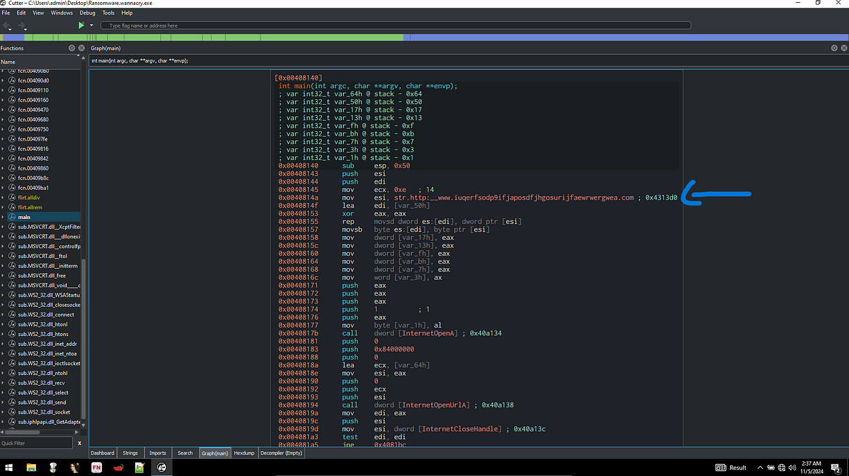 I started by using Cutter to analyze the code statically without executing it. This allowed me to observe how API calls were made in the main function and gain insights into the key operations of the malware, such as encryption, file manipulation, and network communication.